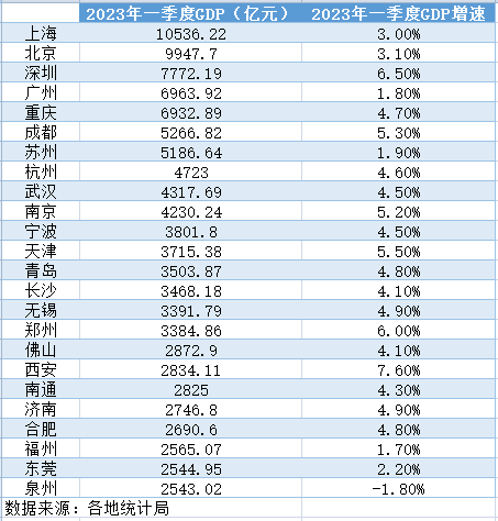 相较而言,18个南方城市中有10个一季度增速低于全国4.5%的平均增长水平。其中,东莞、苏州、广州、福州和泉州一季度GDP增速分别为2.2%、1.9%、1.8%、1.7%和-1.8%。