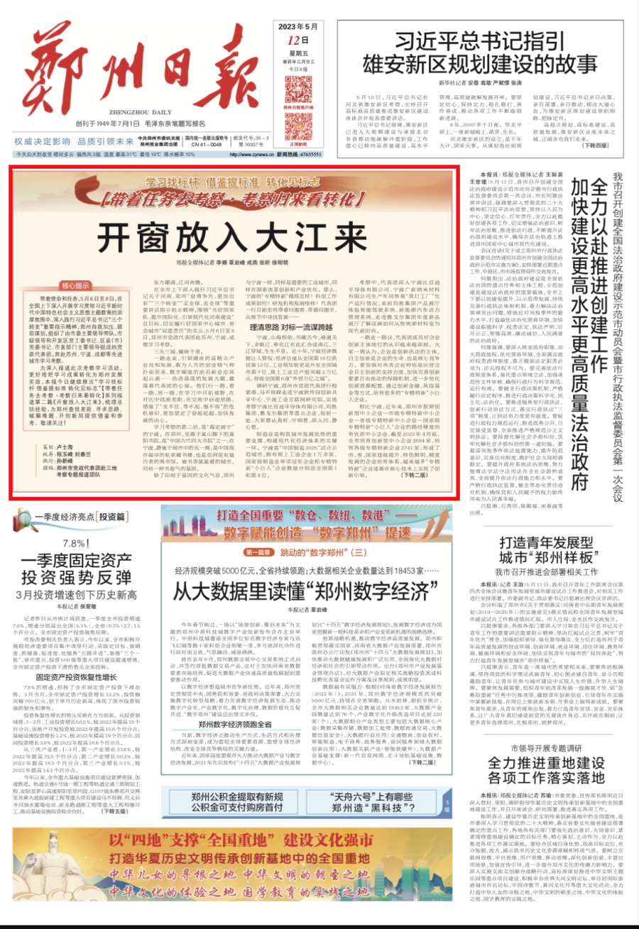 为深入报道此次考察学习活动,更好地把学习成果转化为郑州发展实效,本报今日继续推出“学习找标杆 借鉴提标准 转化见标志”【带着任务去考察 ·考察归来看转化】系列报道第二篇《开窗放入大江来》,梳理总结经验,为郑州查找差距、寻求思路、破解难题、开创新局提供借鉴和参考。敬请关注!