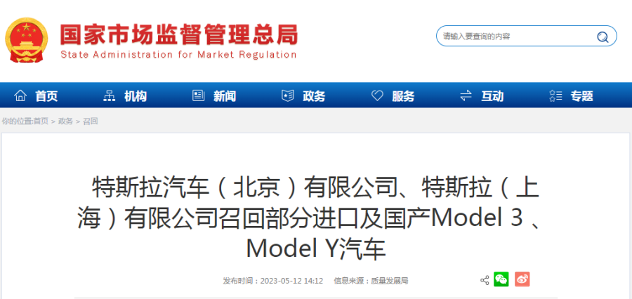据国家市场监督管理总局网站12日消息,日前,特斯拉汽车(北京)有限公司、特斯拉(上海)有限公司根据《缺陷汽车产品召回管理条例》和《缺陷汽车产品召回管理条例实施办法》的要求,向国家市场监督管理总局备案了召回计划。自2023年5月29日起,召回生产日期在2019年1月12日至2023年4月24日期间的部分进口Model S、 Model X 、Model 3及国产Model 3 、Model Y汽车,共计1104622辆。