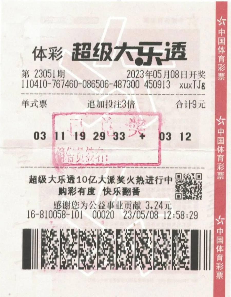 5月8日,体彩超级大乐透第23051期开出21注一等奖,河南收获5注,分落郑州、平顶山和周口。其中周口购彩者幸运揽获3注追加一等奖,中奖彩票是一张1注号码3倍追加投注,花费9元,单票奖金3243万元。