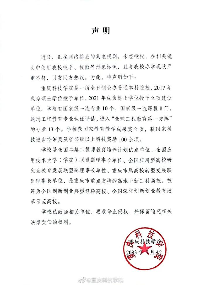 5月12日,重庆科技学院官方微博发布了声明:近日,正在网络播放的某电视剧,未经授权,在相关镜头中使用我校校名、校徽等形象标识,且与我校办学现状严重不符,引发网友热议。