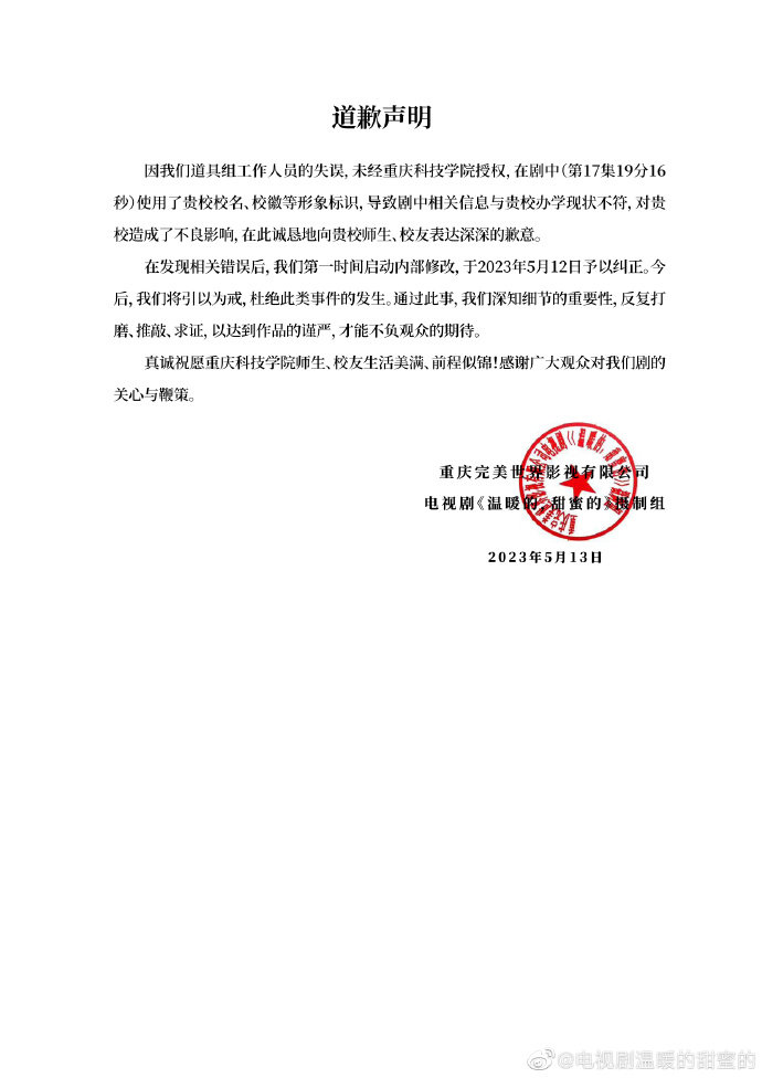 对此,@电视剧温暖的甜蜜的 发布道歉声明:因道具组工作人员失误,未经授权使用该校校名、校徽,导致剧中信息与办校现状不符,造成不良影响,已予以修改纠正。