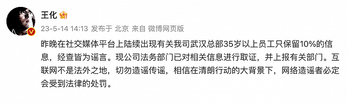 5月14日,小米集团公关部总经理王化在其微博发文称,“昨晚在社交媒体平台上陆续出现有关我司武汉总部35岁以上员工只保留10%的信息,经查皆为谣言。现公司法务部门已对相关信息进行取证,并上报有关部门。”
