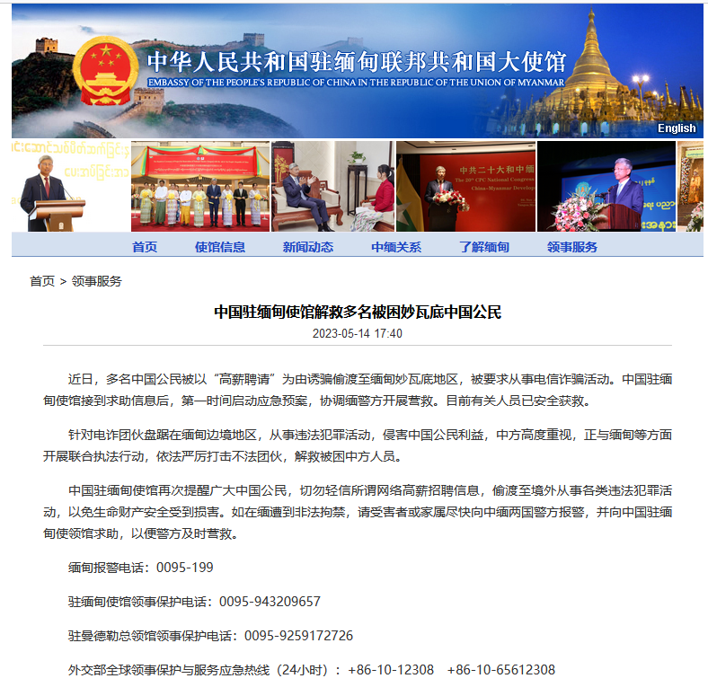 中国驻缅甸使馆再次提醒广大中国公民,切勿轻信所谓网络高薪招聘信息,偷渡至境外从事各类违法犯罪活动,以免生命财产安全受到损害。如在缅遭到非法拘禁,请受害者或家属尽快向中缅两国警方报警,并向中国驻缅甸使领馆求助,以便警方及时营救。