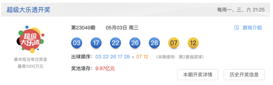 5月3日晚,体彩超级大乐透第23049期开奖,也是超级大乐透10亿大派奖第11期开奖,当期前区开出号码“03、17、22、26、28,后区开出号码“07、12”。当期全国销量为3.31亿元,为国家筹集彩票公益金1.19亿元。全国中出4注一等奖,其中浙江宁波、贵州贵阳两位幸运儿均分1500万派奖奖金,分别擒获1注2549万余元一等奖。