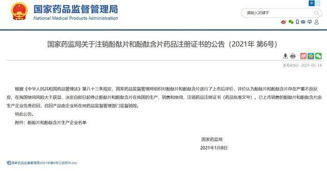 根据《中华人民共和国药品管理法》第八十三条规定,国家药品监督管理局组织对酚酞片和酚酞含片进行了上市后评价,评价认为酚酞片和酚酞含片存在严重不良反应,在我国使用风险大于获益,决定自即日起停止酚酞片和酚酞含片在我国的生产、销售和使用,注销药品注册证书(药品批准文号)。已上市销售的酚酞片和酚酞含片由生产企业负责召回,召回产品由企业所在地药品监督管理部门监督销毁。