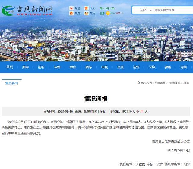 事故发生后,宣恩县人民政府新闻办公室发布情况通报:“2023年5月16日11时19分许,宣恩县珠山镇狮子关景区一商务车从水上浮桥落水,车上载有8人,3人脱险上岸,5人搜救上岸后经抢救无效死亡。事件发生后,州县党委政府高度重视,第一时间带领相关部门赶往现场进行救援和处置,目前景区已暂停营业,善后事宜及事故调查正在有序开展。”知情人告诉记者,车上8人均来自山西长治,死者中3名女性2名男性,年龄都在50岁至55岁,没有姓氏相同的情况。