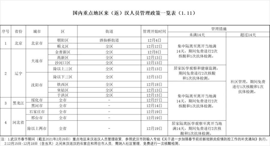 -武汉:重点地区人员,14天集中隔离+2次核酸1次抗体检测