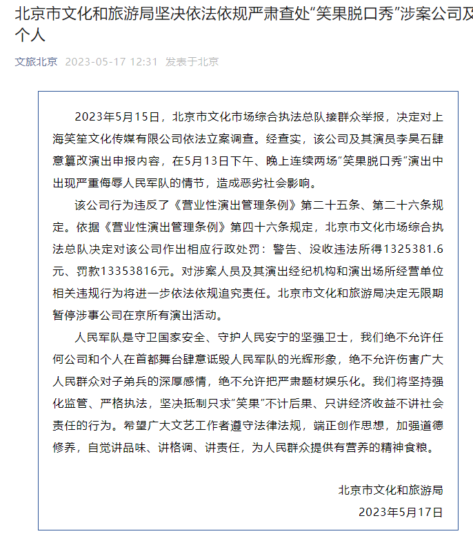据“文旅北京”微信公号消息,2023年5月15日,北京市文化市场综合执法总队接群众举报,决定对上海笑笙文化传媒有限公司依法立案调查。经查实,该公司及其演员李昊石肆意篡改演出申报内容,在5月13日下午、晚上连续两场“笑果脱口秀”演出中出现严重侮辱人民军队的情节,造成恶劣社会影响。