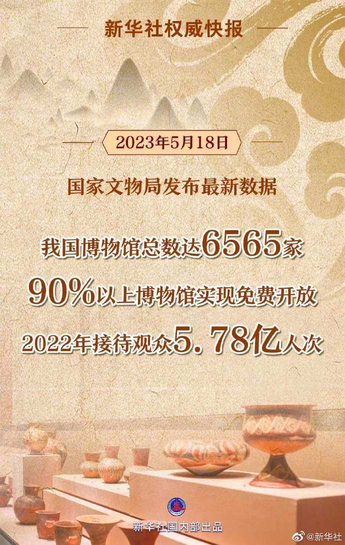 5月18日,国家文物局发布的最新数据显示,2022年,我国新增备案博物馆382家,全国博物馆总数达6565家,排名全球前列。据统计,2022年全年我国博物馆举办线下展览3.4万个、教育活动近23万场,接待观众5.78亿人次,推出线上展览近万个、教育活动4万余场,网络浏览量近10亿人次,新媒体浏览量超过百亿人次。通过持续完善博物馆免费开放政策,我国90%以上的博物馆实现免费开放。