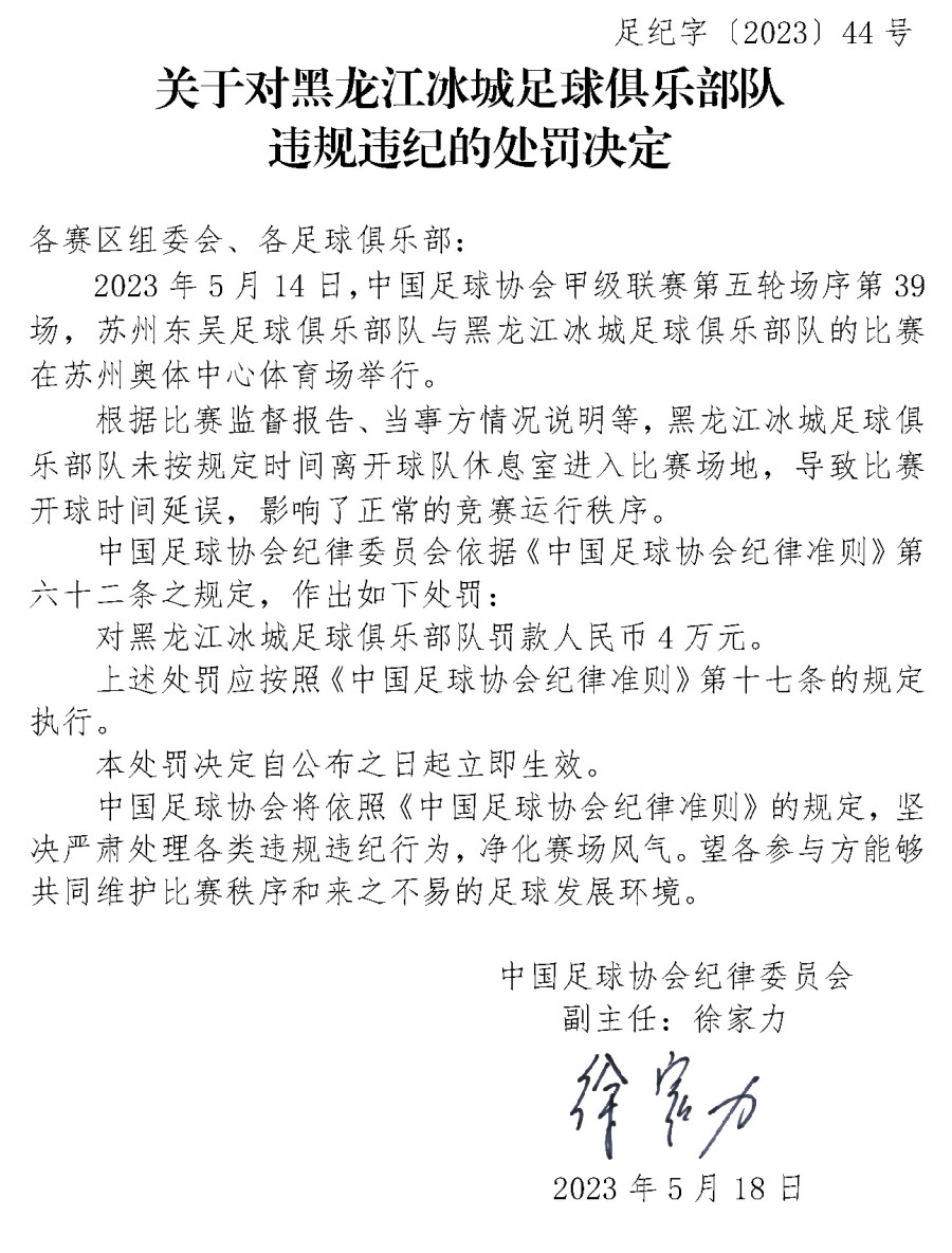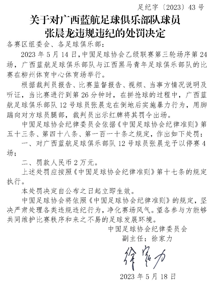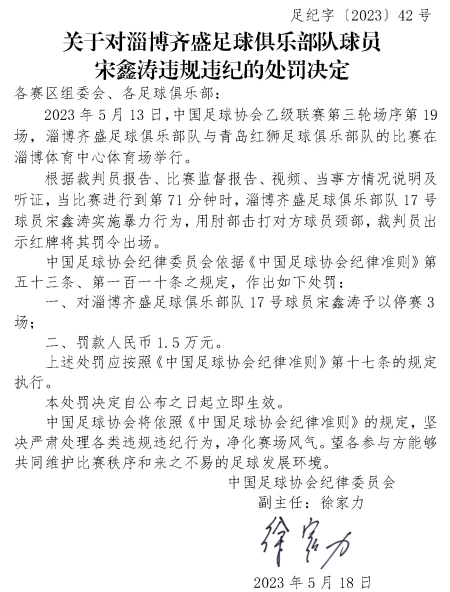 5月18日,中国足协官网连发三份处罚决定,对淄博齐盛足球俱乐部队球员宋鑫涛、广西蓝航足球俱乐部队球员张晨龙和黑龙江冰城足球俱乐部队进行停赛或罚款处罚。