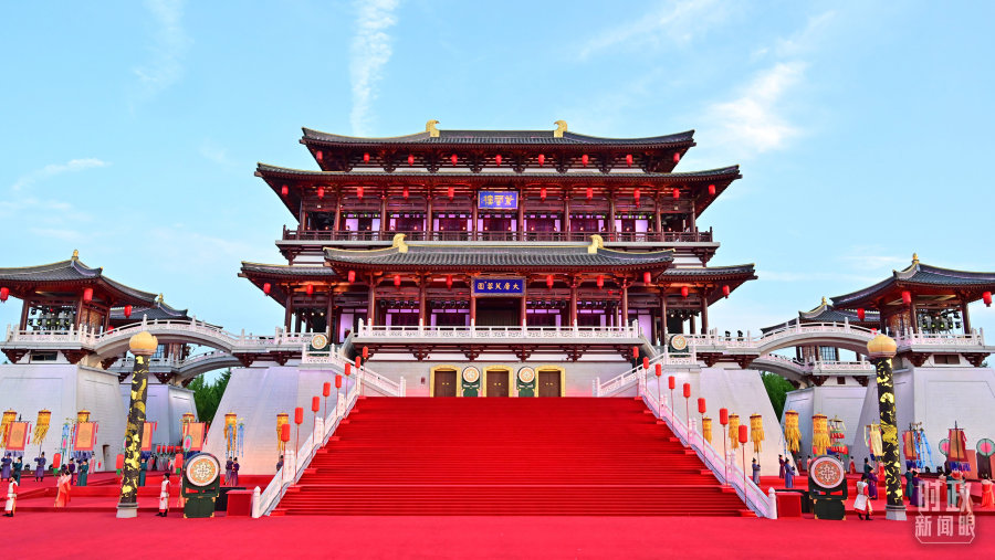 △紫云楼是大唐芙蓉园最主要的仿唐建筑群之一。18日晚的迎宾表演就是以紫云楼为背景。(总台央视记者刘琦拍摄)