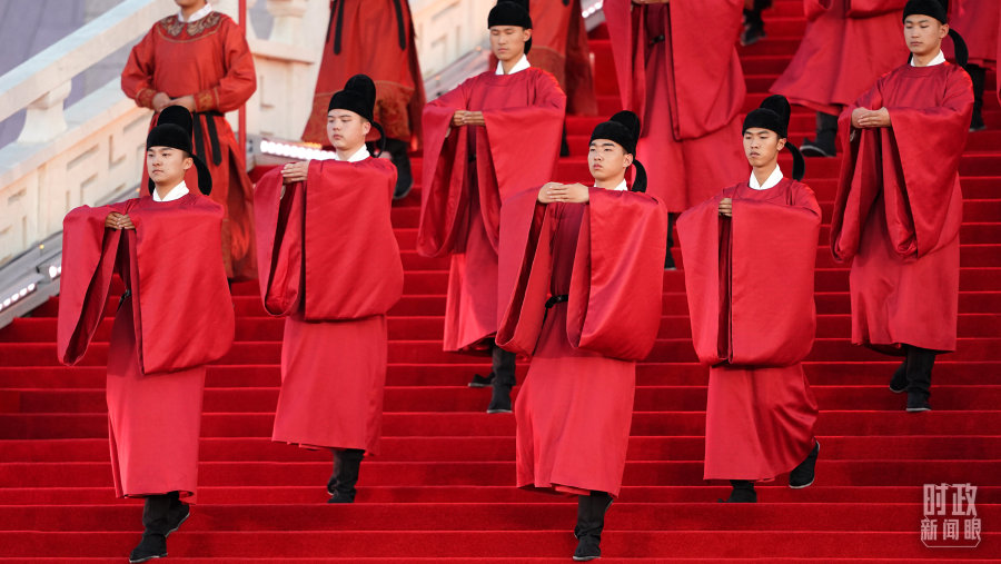 当晚的迎宾表演以“大唐盛礼”为主题,复原唐朝时期迎宾礼仪,以传统文化之“礼”,迎远道而来之“宾”。