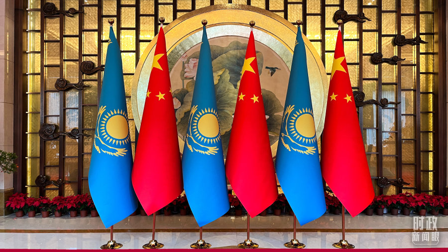 △中哈两国元首会谈现场外布置的两国国旗。(总台央视记者陆泓宇拍摄)