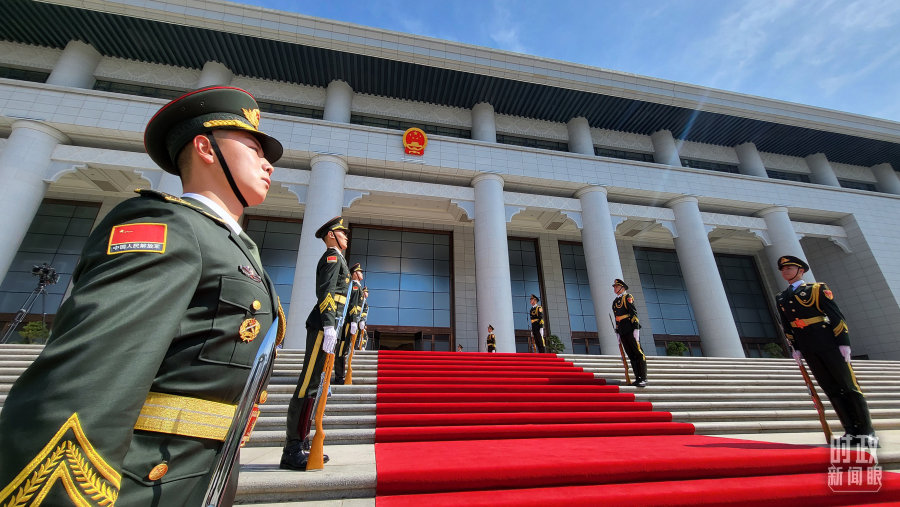 △陕西宾馆会议中心外,礼兵列队迎接贵宾。(总台央视记者钟信伟拍摄)
