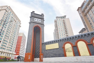 站在平等街北口,首先映入眼帘的是一座8米高的青砖三角柱形砖牌式仿古建筑,与南侧商代王城遗址城垣相呼应。