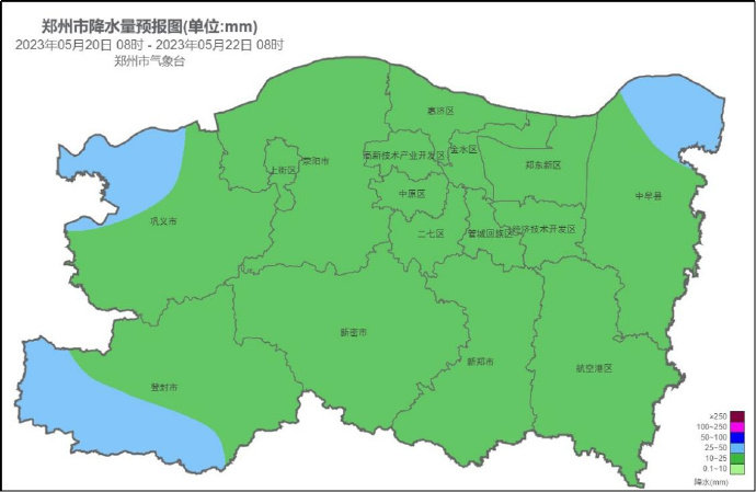 5月20日08时至22日08时郑州市降水量预报图(单位:mm)