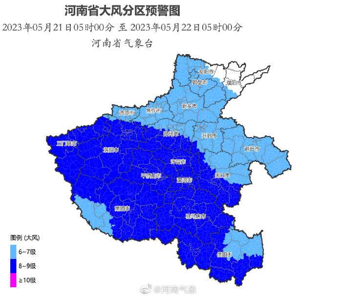 河南省气象台2023年5月20日17时发布大风蓝色预警:预计今天夜里,全省东北风4级左右,阵风7级左右。明天白天到夜里,全省大部偏北风5级左右,阵风7级左右,其中三门峡、洛阳、南阳、郑州西部和南部、开封西南部、周口西部和南部、许昌、漯河、平顶山、驻马店、信阳西部和南部部分县市阵风8到9级。请注意防范。