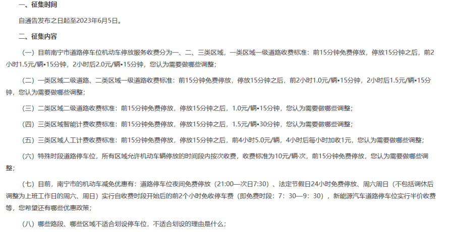 22日深夜,南宁市人民政府发布关于广泛征集南宁市道路停车位收费意见建议的通告,征集内容共13条,涉停车收费标准,道路及区域划设停车位是否合适等。