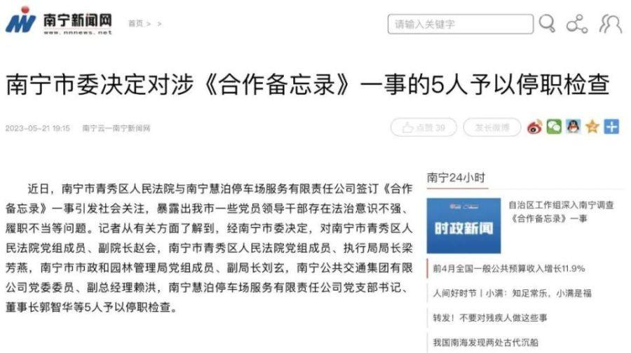 5月19日公开的通报指出,广西壮族自治区高级人民法院对《合作备忘录》内容进行了审查。区高院经审查认为,青秀区法院与特定企业签署合作备忘录不符合公平公正的原则,5月19日已责成青秀区法院与慧泊公司解除了《合作备忘录》。