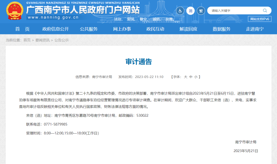 南宁市审计局网站22日发布通告:南宁市审计局派出审计组自2023年5月21日至6月15日,进驻南宁慧泊停车场服务有限责任公司,对南宁市道路停车泊位经营管理情况进行专项审计调查。