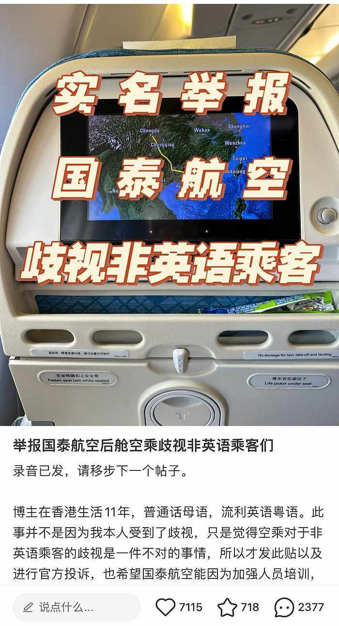 服务标准取决于乘客英语水平?5月22日,有旅客在社交媒体发帖“实名举报国泰航空歧视非英语乘客”。帖子提到,其搭乘国泰航空CX987航班由成都飞往香港,选座为后排、靠近乘务员准备餐食及休息处。但是自坐下开始,不断听见后舱乘务员用英文及粤语抱怨、歧视旅客,甚至用轻蔑的语气嘲笑他们的英语水平。