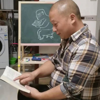 徐世海正在看书,黑板上是儿子为他画的简笔画。受访者供图