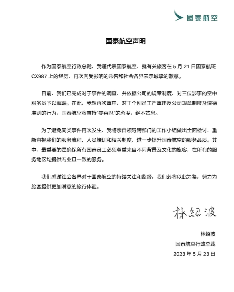 作为国泰航空行政总裁,林绍波代表国泰航空,就有关旅客在5月21日国泰航班CX987上的经历,再次向受影响的乘客和社会各界表示诚挚的歉意。 目前,我们已完成对于事件的调查,并依据公司的规章制度,对三位涉事的空中服务员予以解聘。在此,我想再次重申,对于个别员工严重违反公司规章制度及道德准则的行为,国泰航空将秉持“零容忍”的态度,绝不姑息。 为了避免同类事件再次发生,我将亲自领导跨部门的工作小组作出全面检讨,重新审视我们的服务流程、人员培训和相关制度,进一步提升国泰航空的服务品质;其中最重要的,是确保所有国泰员工必须尊重来自不同背景及文化的旅客,在所有的服务地区均提供专业且一致的服务。 我们感谢社会各界对于国泰航空的持续关注和监督,我们必将以此为鉴,努力为旅客提供更加满意的旅行体验。