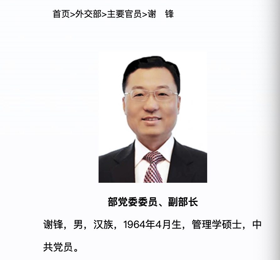 外交部网站显示,谢锋,男,汉族,1964年4月生,管理学硕士,中共党员。赴任中国驻美大使前,任外交部党委委员、副部长。