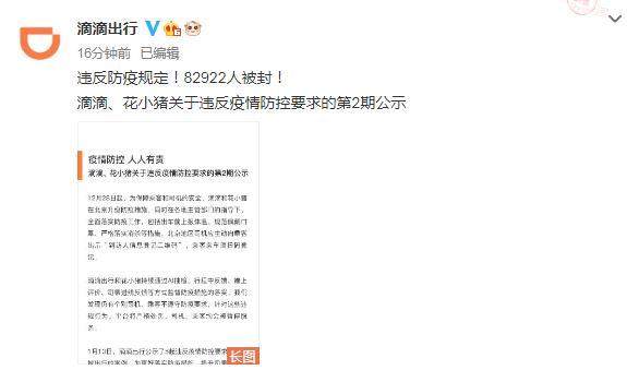 (原题为:《违反防疫规定,滴滴、花小猪82922名司机和乘客被封!》)