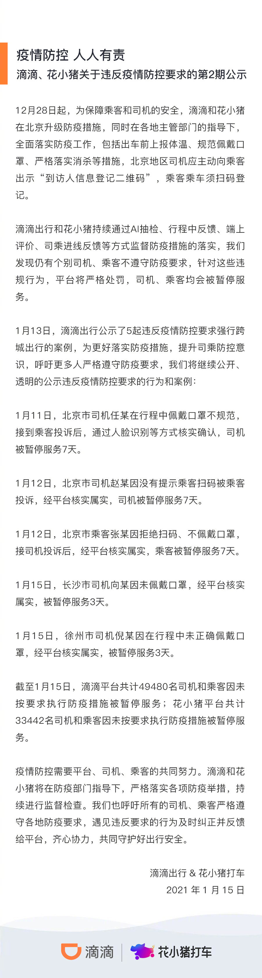 截至1月15日,49480名未按要求执行防疫措施的司机和乘客被滴滴平台暂停服务;33442名司机和乘客因未按要求执行防疫措施被花小猪平台暂停服务。