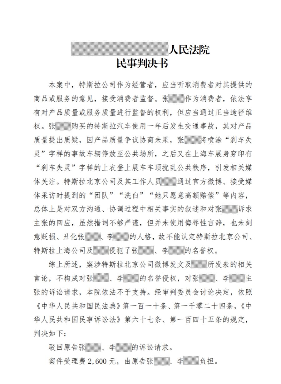 近日,上海市青浦区人民法院就特斯拉河南安阳女车主张女士的两个案件做出判决,法院驳回了张女士起诉特斯拉的诉讼请求,特斯拉胜诉。