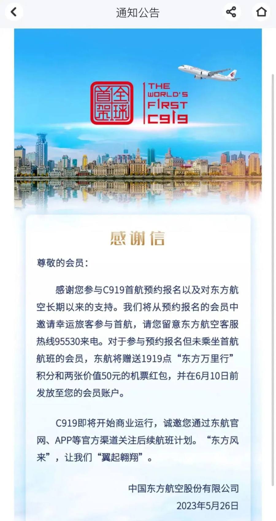 东航APP公告截图
