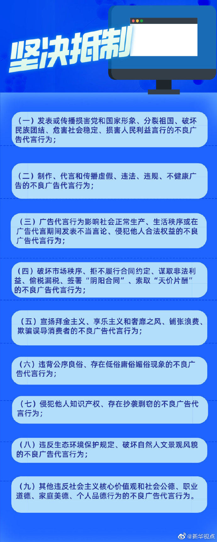 @新华视点1月16日消息,中国文联16日发布《文艺工作者广告代言自律公约》,提出坚决抵制破坏市场秩序、拒不履行合同约定、谋取非法利益、偷税漏税、签署“阴阳合同”、索取“天价片酬”;侵犯他人知识产权、存在抄袭剽窃;违反生态环境保护规定、破坏自然人文景观风貌等9项不良广告代言行为。