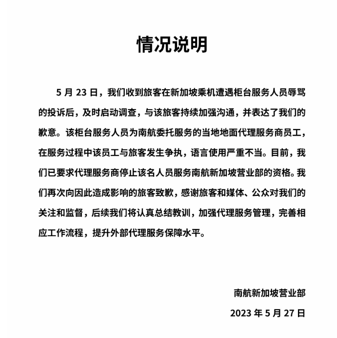 5月27日,“中国南方航空驻新加坡营业部”微信公众号发布情况说明称:“5月23日,我们收到旅客在新加坡乘机遭遇柜台服务人员辱骂的投诉后,及时启动调查,与该旅客持续加强沟通,并表达了我们的歉意。该柜台服务人员为南航委托服务的当地地面代理服务商员工,在服务过程中该员工与旅客发生争执,语言使用严重不当。目前,我们已要求代理服务商停止该名人员服务南航新加坡营业部的资格。”