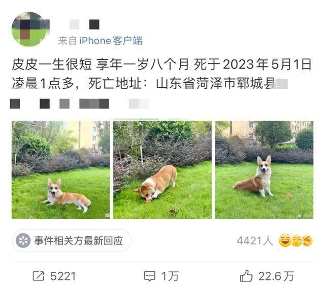 此前媒体报道,5月28日,山东省菏泽市郓城县,一女子在社交平台发文求助,称丈夫李某喝醉后,持刀砍死了家中宠物狗柯基,并持刀指着她威胁说:“你不听话,以后也这样!” 女子表示非常害怕,要求和李某离婚,并让其受到相应处罚。