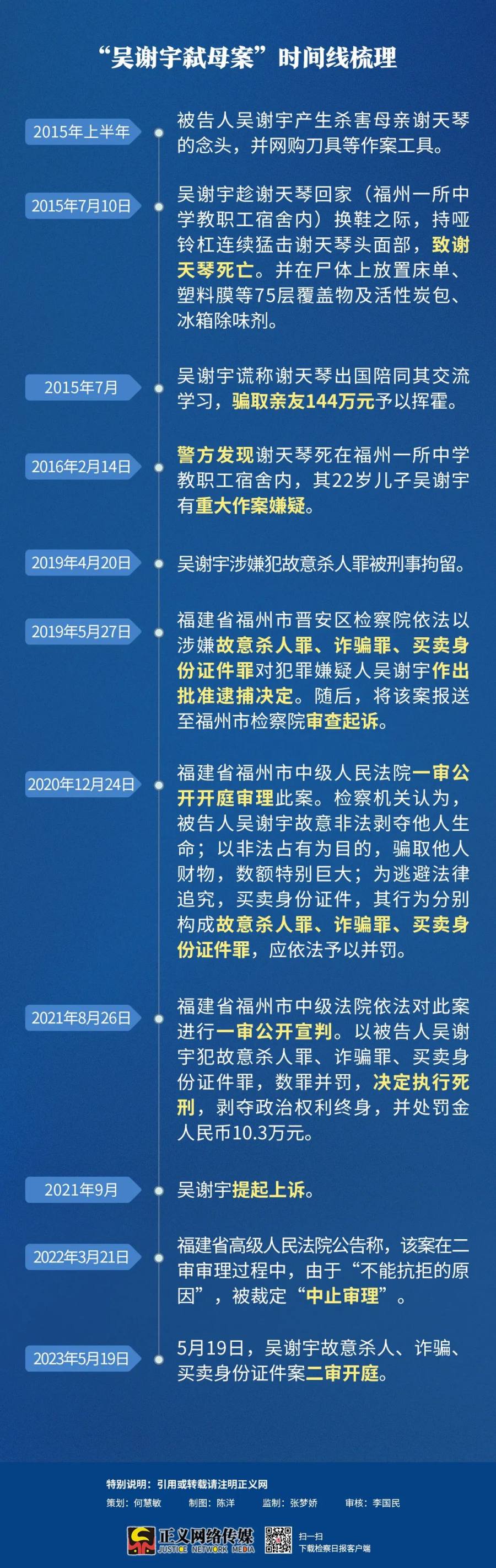福建高院消息,2023年5月30日,福建省高级人民法院对吴谢宇故意杀人、诈骗、买卖身份证件上诉一案二审公开宣判,裁定驳回上诉,维持原判。