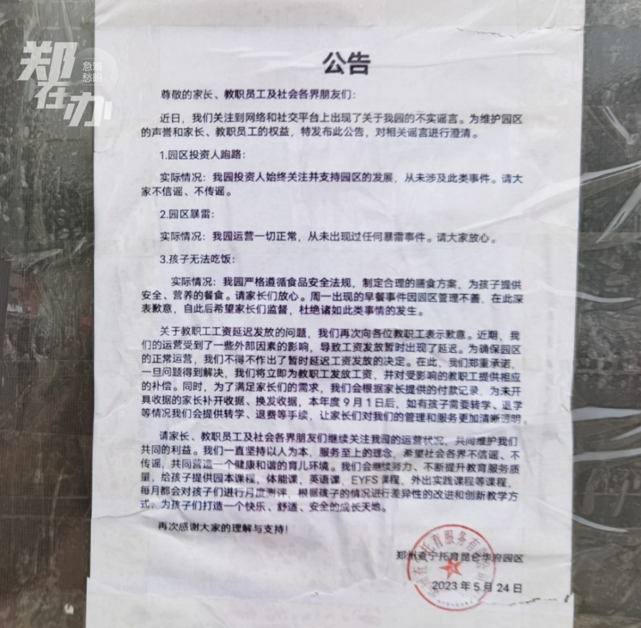 上周辟谣“跑路”,这周突然“关门”!郑州一幼儿园也玩起了“不告而别”
