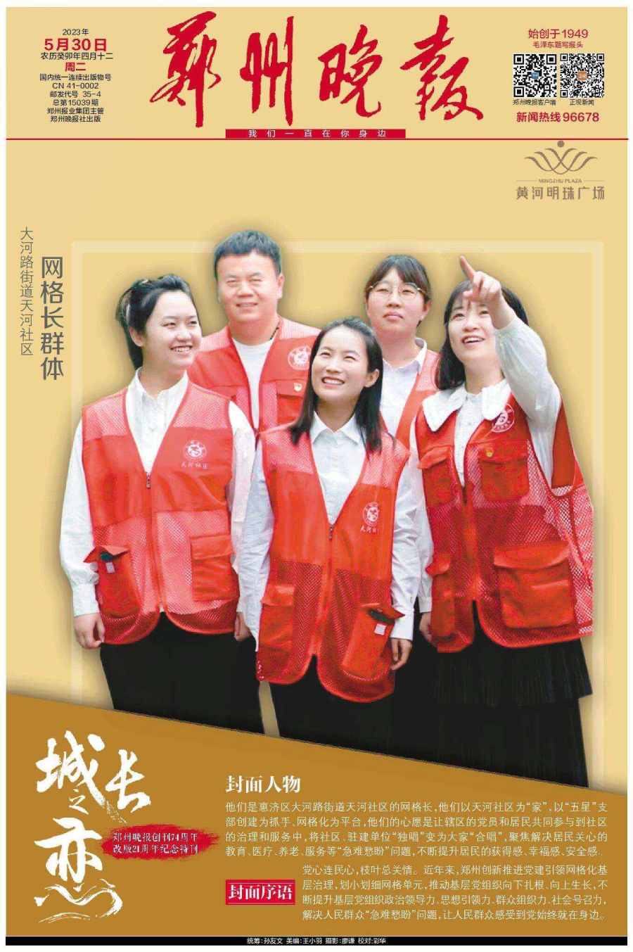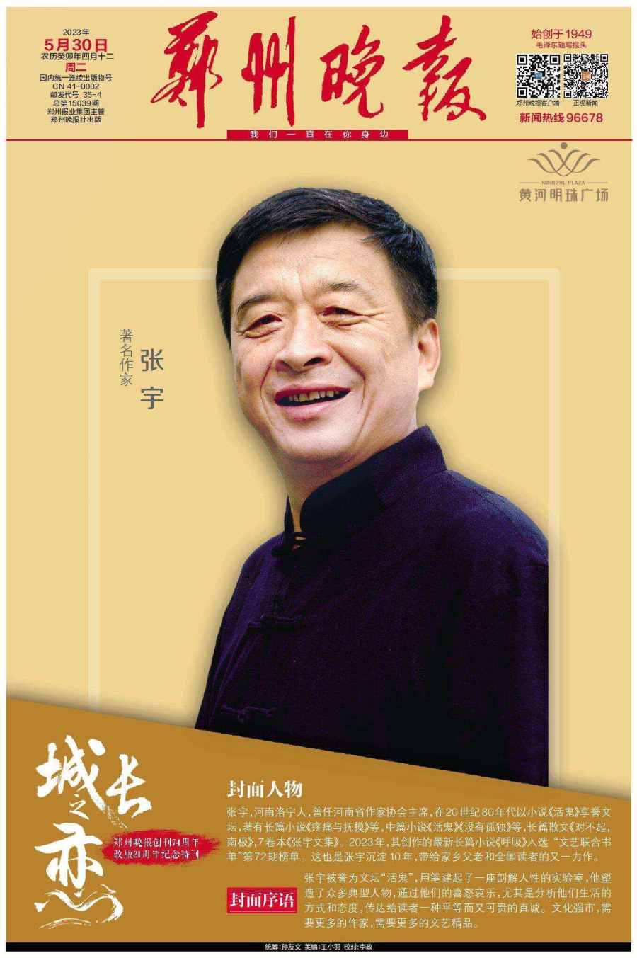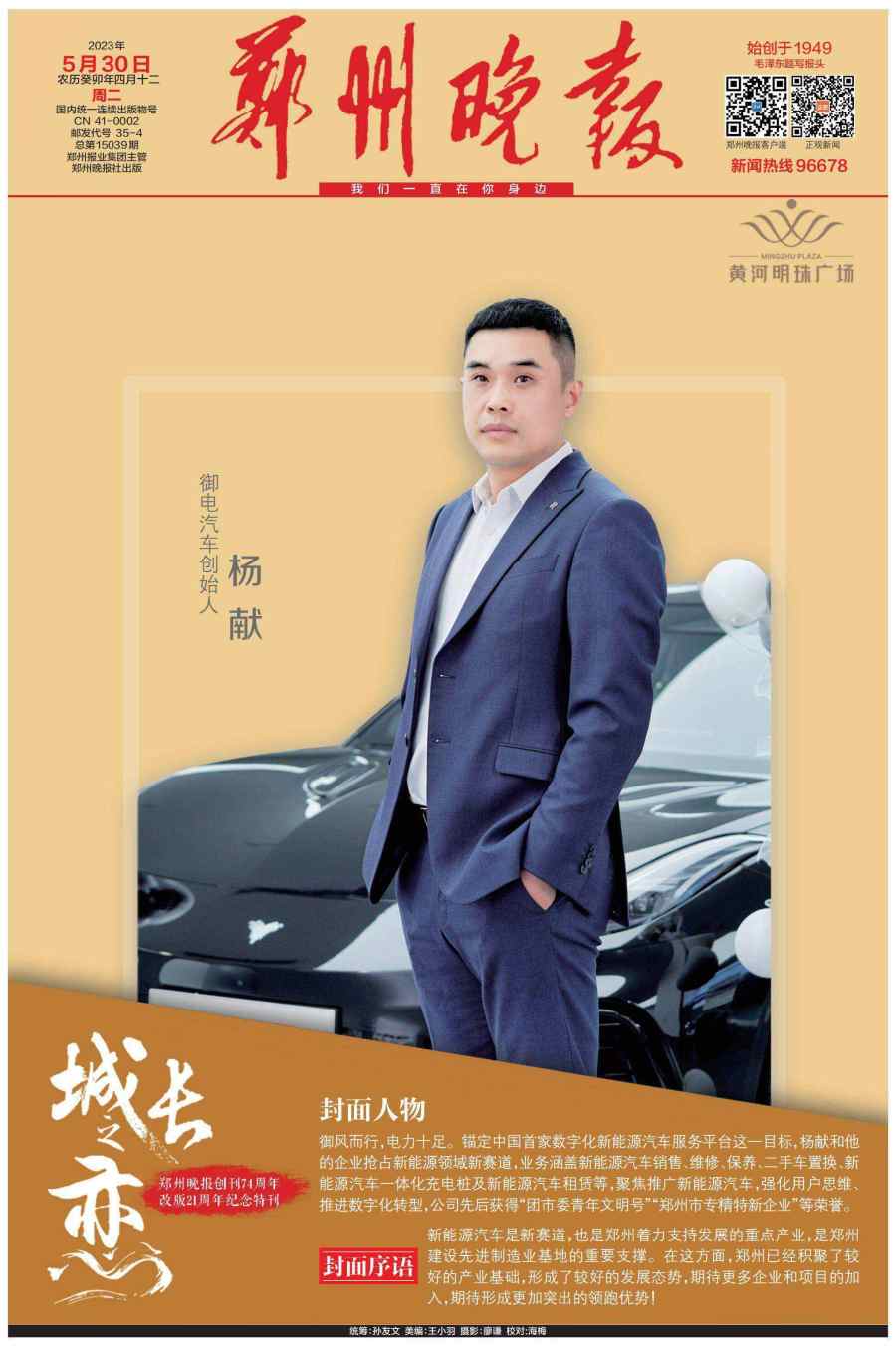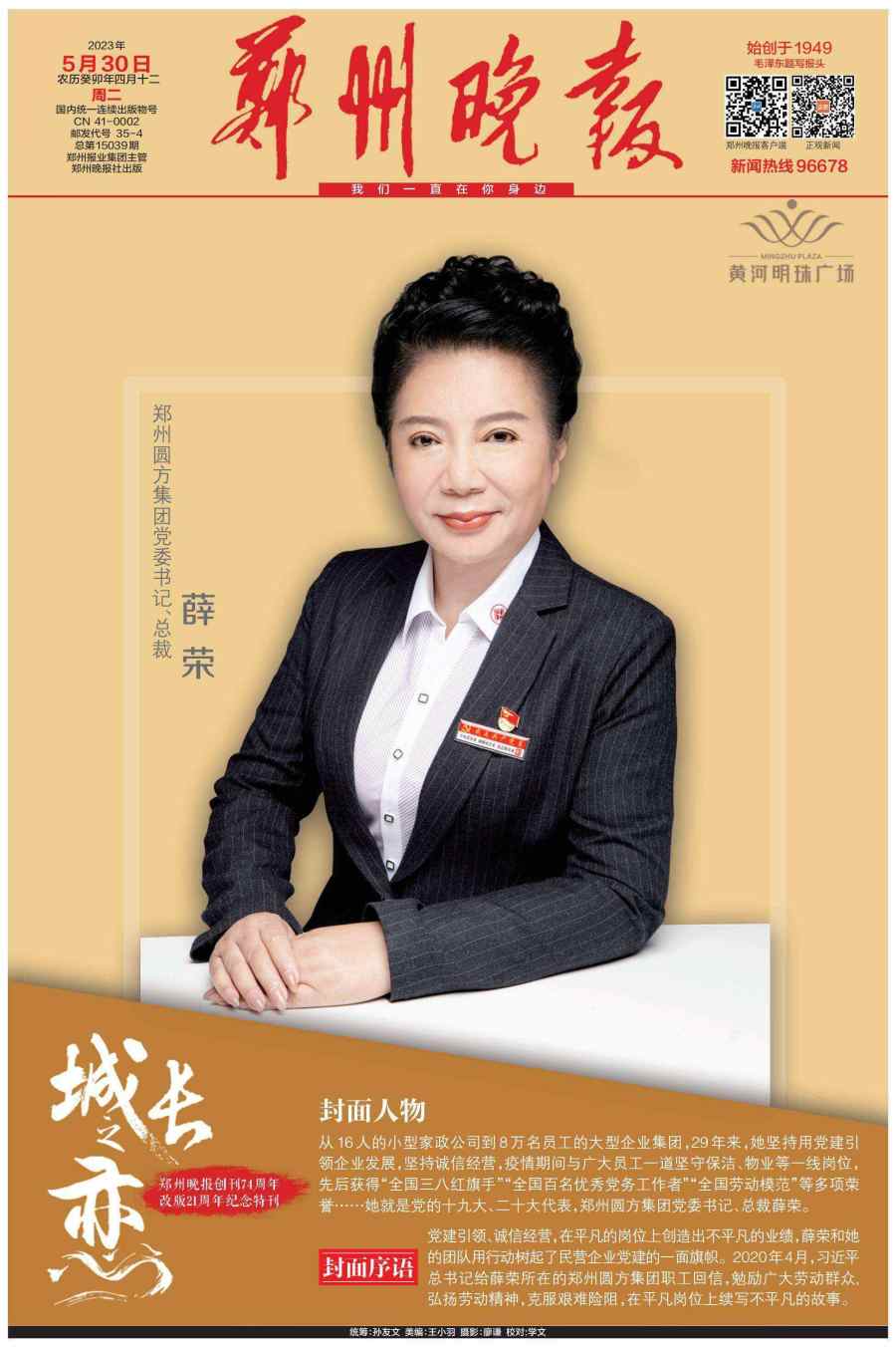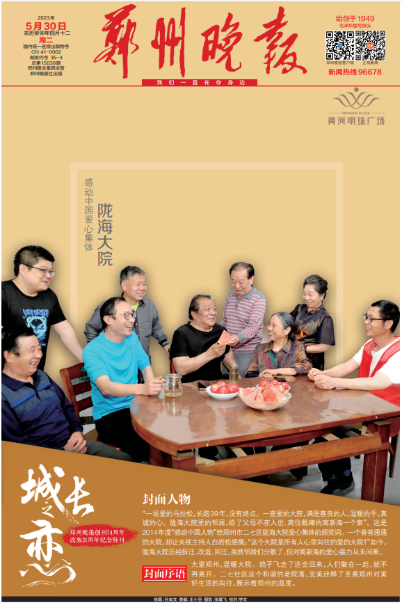 5月30日,郑州晚报重磅推出创刊74周年、改版21周年的百版特刊《城长之恋》,邀请21位行业领军人物登上郑州晚报的封面和郑州市区多个户外大屏。