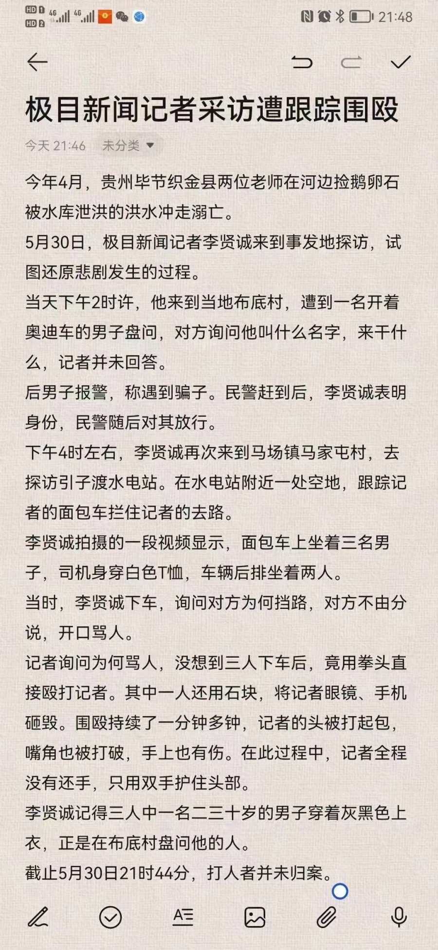 5月30日,极目新闻一名记者前往事发地贵州毕节采访时,遭遇一辆面包车拦路,随后遭到车上三人殴打,手机和眼镜被砸碎,打人者临走前还抹去了指纹。目前,打人者已经到案,官方正在调查。
