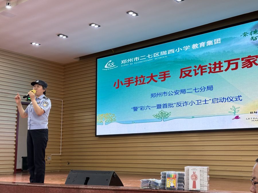 5月31日,在“六一儿童节”到来之际,为营造全民防范电信网络诈骗的氛围,积极构建“小手拉大手,反诈进万家”防诈宣传工作格局,发动学生向家庭成员及邻里长辈宣传反诈知识,郑州市公安局二七分局组织民警走进二七区陇西小学,为小学生传授反诈、禁毒、安全知识,并为全区首批百名“反诈小卫士”送上了统一标识的志愿服。