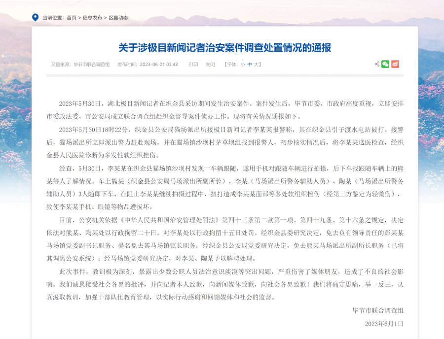 2023年5月30日,湖北极目新闻记者在织金县采访期间发生治安案件。案件发生后,毕节市委、市政府高度重视,立即安排市委政法委、市公安局成立联合调查组赴织金督导案件侦办工作。现将有关情况通报如下。