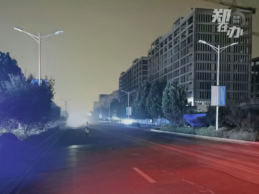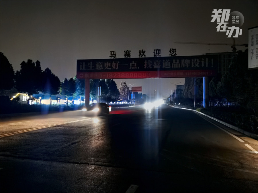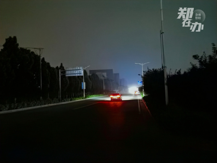 5月31日晚9时,记者沿西四环与公明路交叉口向西行驶至郑州绕城高速桥与警官大道交会处,全长约4公里的路段未见有路灯点亮,仅部分临路企业和沿途农家乐经营场所悬挂的彩灯能给夜行的车辆和人员提供少许照明。