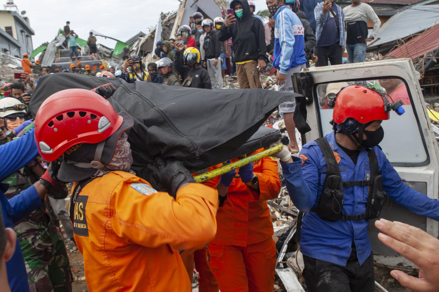 1月16日,在印度尼西亚西苏拉威西省马穆朱,救援人员搬运一具遇难者遗体。(新华社发,奥潘摄)