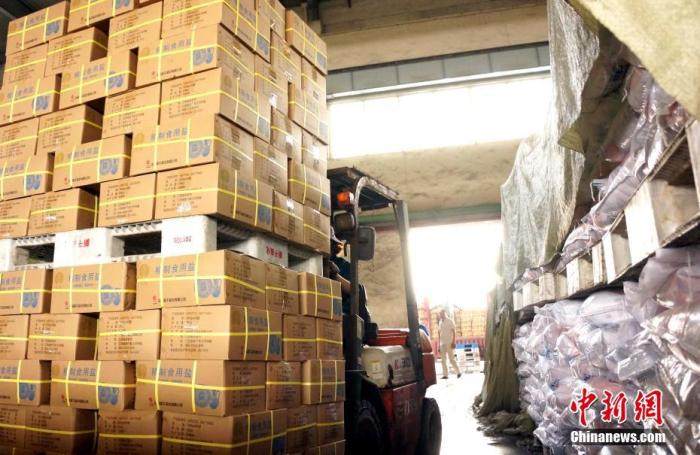 工人将包装好的食盐放入仓库。 王昊阳 摄