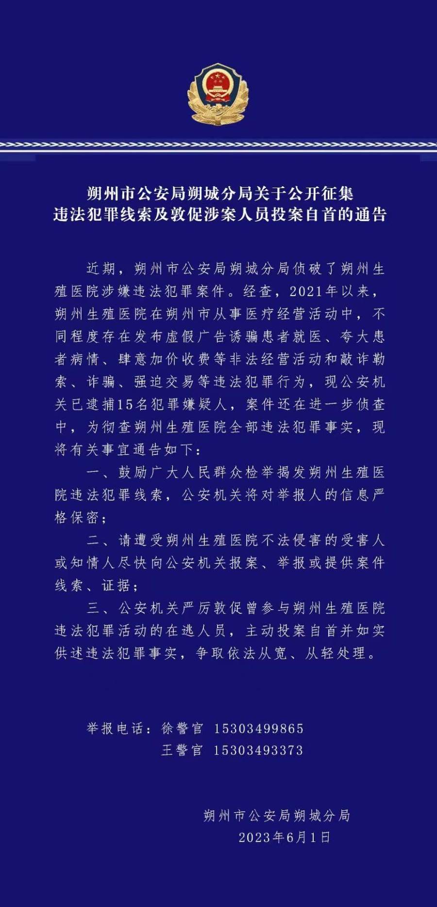 近期,山西省朔州市公安局朔城分局侦破了朔州生殖医院涉嫌违法犯罪案件。朔城警方日前发布通告称,2021年以来,朔州生殖医院在朔州市从事医疗经营活动中,不同程度存在发布虚假广告诱骗患者就医、夸大患者病情、肆意加价收费等非法经营活动和敲诈勒索、诈骗、强迫交易等违法犯罪行为,现公安机关已逮捕15名犯罪嫌疑人。