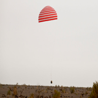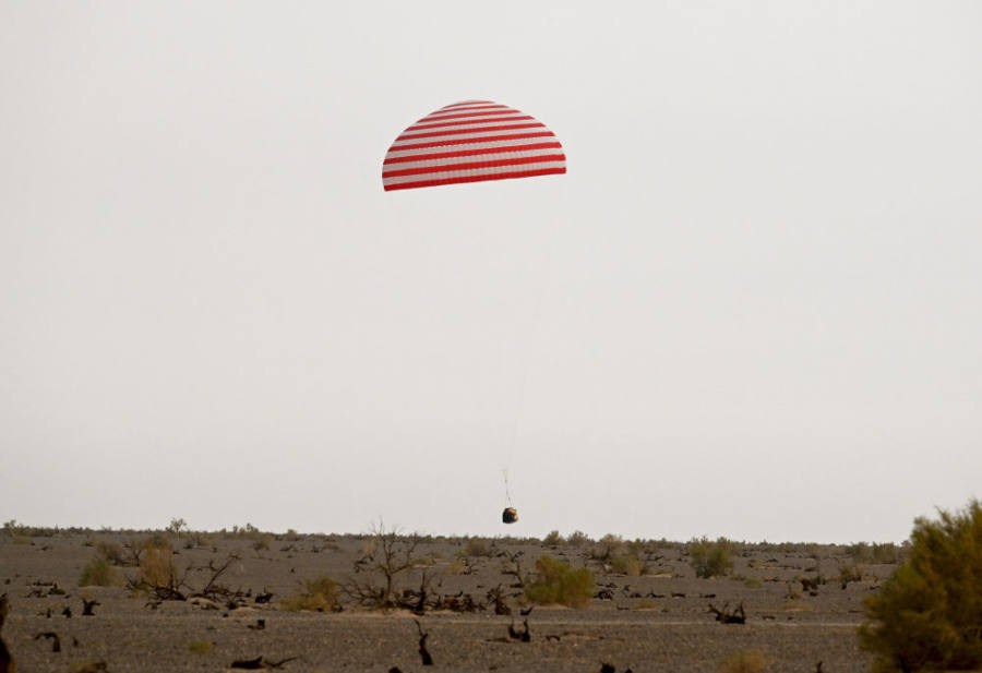 随后,空旷的戈壁滩传来“砰”的一声巨响。距离地面大约10公里,伞舱盖从返回舱上弹落,红白相间的降落伞打开。