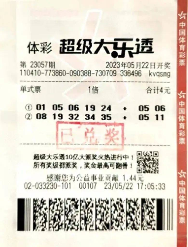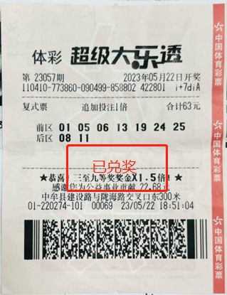 5月22日,体彩超级大乐透第23057期开奖,前区开出号码01、05、06、19、24;后区开出号码05、11。当期二等奖开出92注,郑州市中牟县4101220274体彩实体店的购彩者牛先生喜中体彩超级大乐透二等奖1注,五等奖10注和八等奖10注,共计奖金39.8万余元。