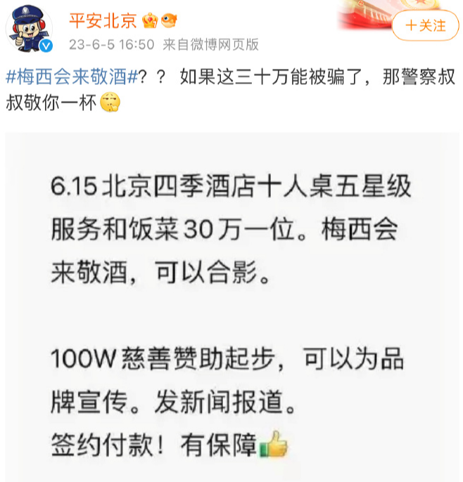 对此,@平安北京 6月5日发布微博称,“如果这三十万能被骗了,那警察叔叔敬你一杯。”