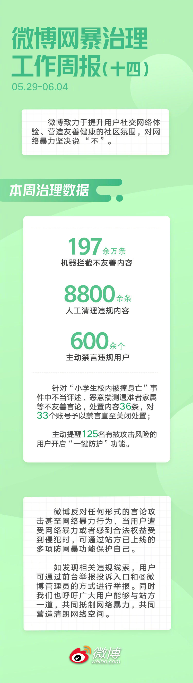 微博一直将防范打击网络暴力行为、营造友善健康的社区氛围视为平台义不容辞的责任。微博持续开展网络暴力专项治理工作,现将一周治理情况公示如下:
